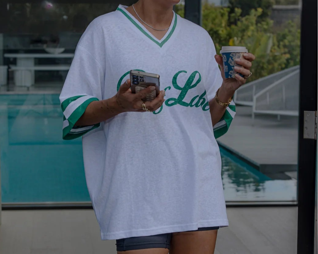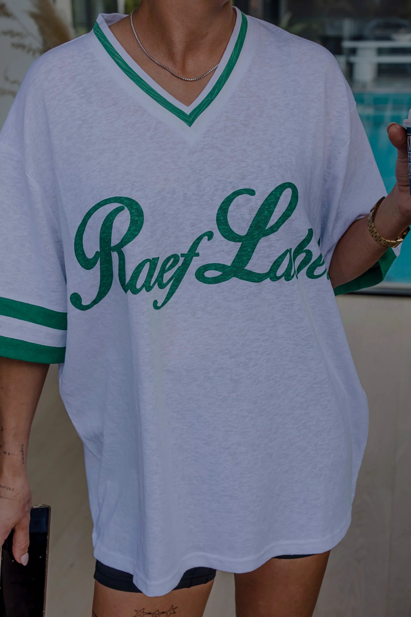 The Est. Raef Graphic Tee in white is a statement piece with a sporty edge. Made from a jersey Slub. It features a bold Raef Label logo across the chest, contrast green sleeve stripes, and a retro-inspired v-neckline. With its relaxed, oversized fit, this tee is perfect for throwing on with your go-to denim or wide leg pants for a casual-cool look.