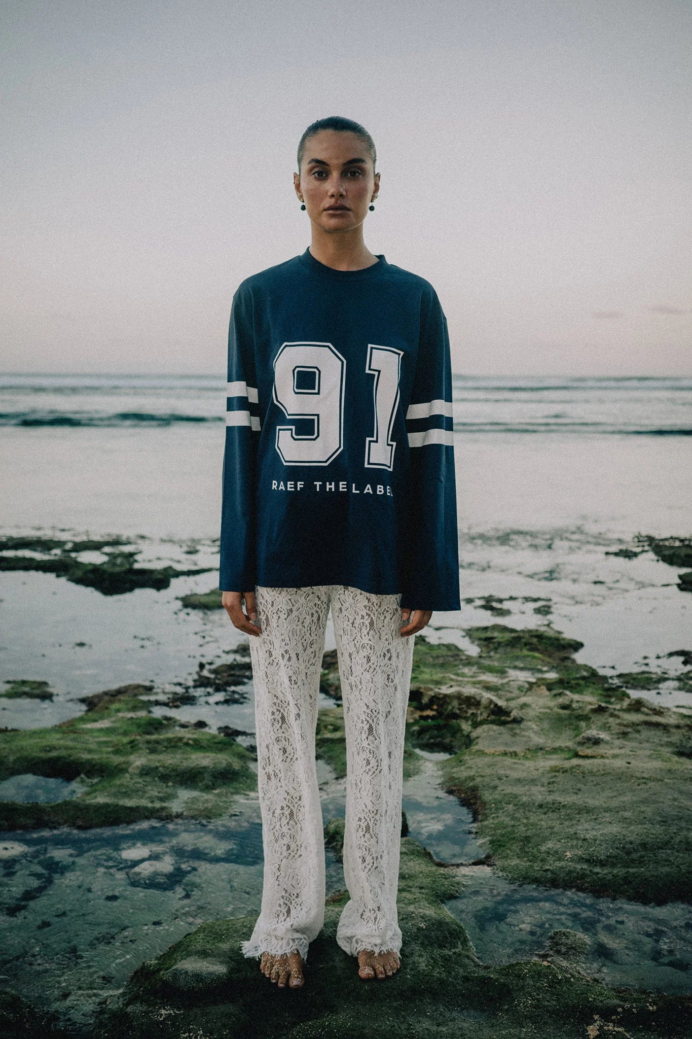 It features an oversized, relaxed fit with a high crew neckline and wide cuffs for a clean finish. Made from premium cotton fabric, the top displays a contrasting white logo on both the front and sleeves, creating a bold and sporty look. For an elevated outfit, pair it with the Shiloh Lace Pant!