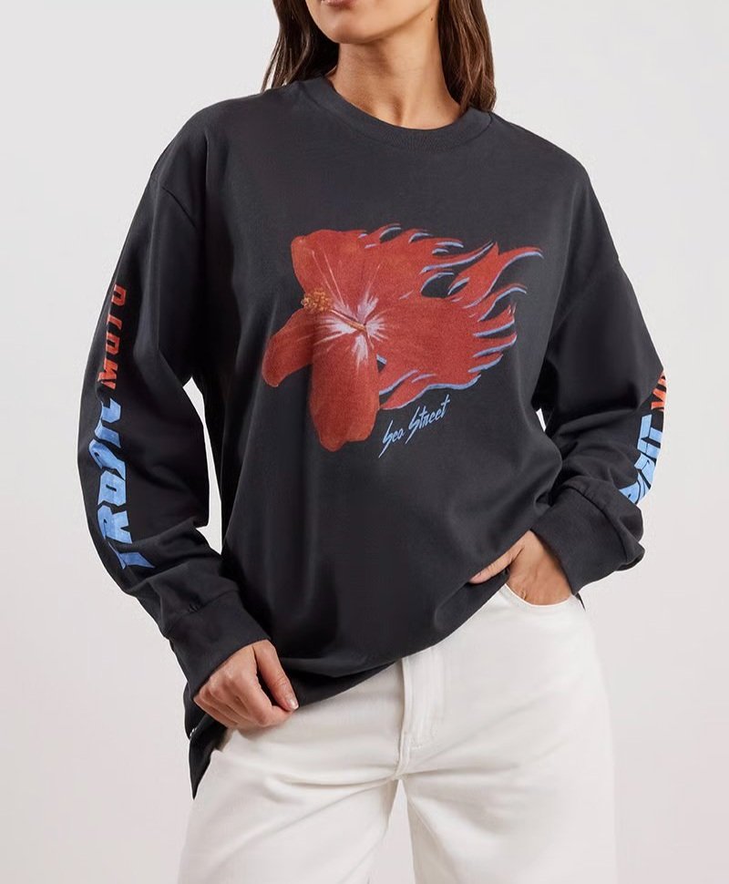 Turn up the heat with the Flaming Hibiscus Long Sleeve — a bold floral statement with serious attitude. This washed-black tee features a striking oversized hibiscus ignited in flame, bringing a punch of tropical energy to cooler days. "Tropic Moto" graphics ride down both sleeves, adding a nostalgic street-racer edge.