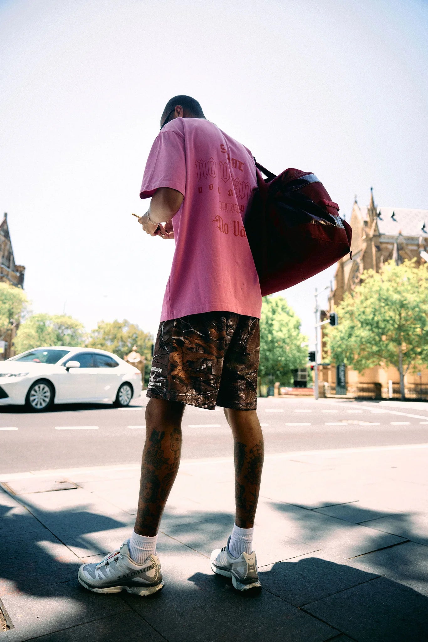 Introducing the No Vacancy Tee in Dark Pink Acid Wash. This unisex design features a bold SŚAINT logo on the front and a compilation of No Vacancy prints on the back - both in a contrasting Pink tone. Inspired by our iconic No Vacancy fragrance - a scent made to turn heads and spark compliments, this tee exudes main character energy. Bold, stylish, and impossible to ignore.