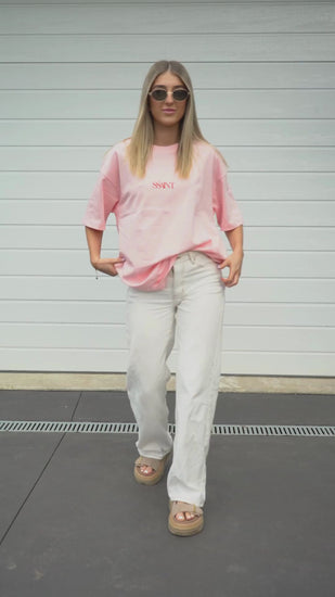 Introducing the No Vacancy Tee in pink. This unisex design features a bold red SŚAINT logo on the front and a compilation of No Vacancy prints on the back. Inspired by our iconic No Vacancy fragrance - a scent made to turn heads and spark compliments, this tee exudes main character energy. Bold, stylish, and impossible to ignore.
