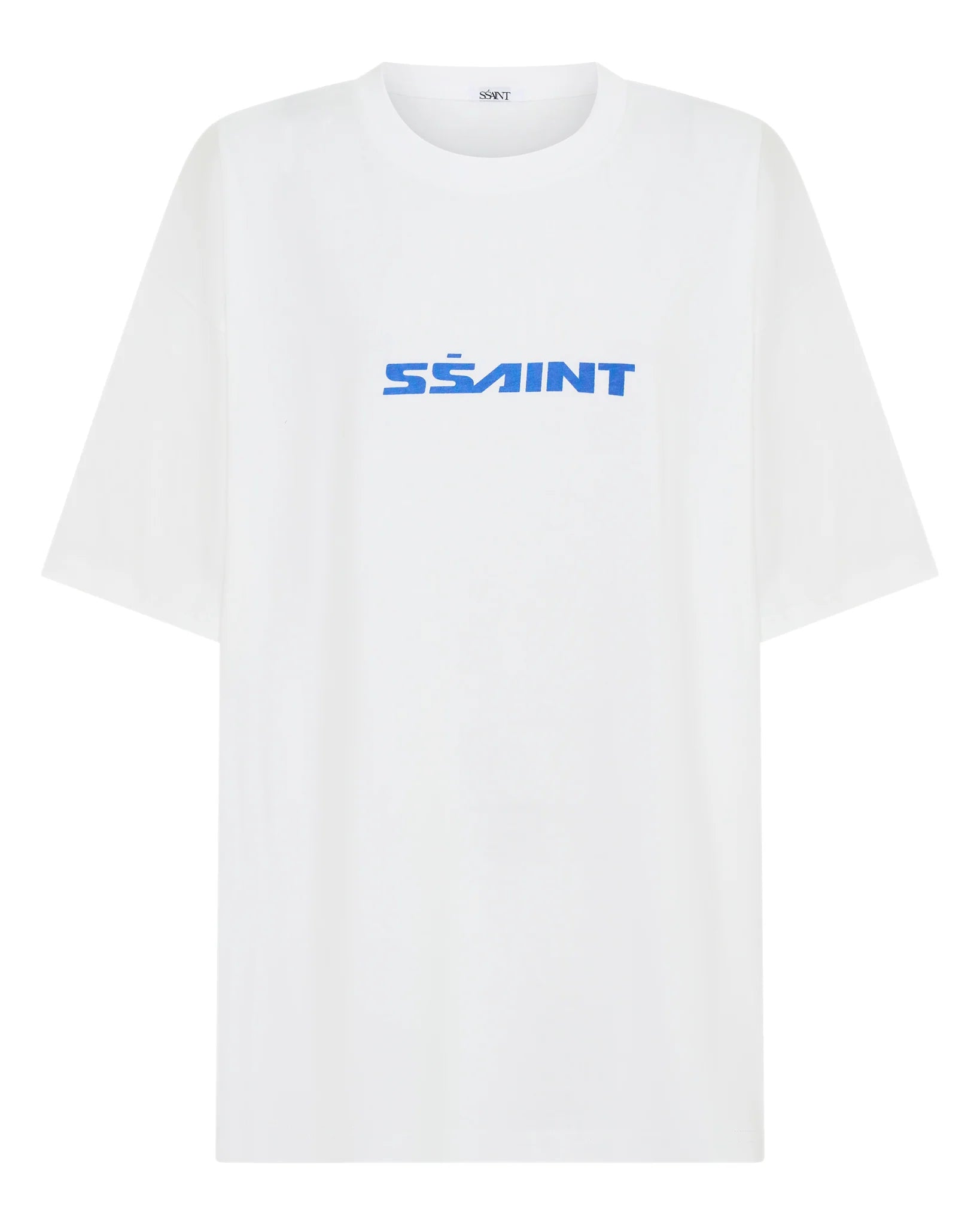 Introducing The Racer Tee, a unisex essential built for style and comfort. This white tee features a bold blue SŚAINT logo on the front and a dynamic race-inspired print on the back. Chase the scent of victory.